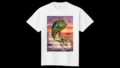 次の釣行は、このTシャツで最高のストライクを狙いに行きませんか?美しいサンセットと南国のヤシの木をバックに、今にも飛び出してきそうな水しぶきの描写はインパクト抜群です!
