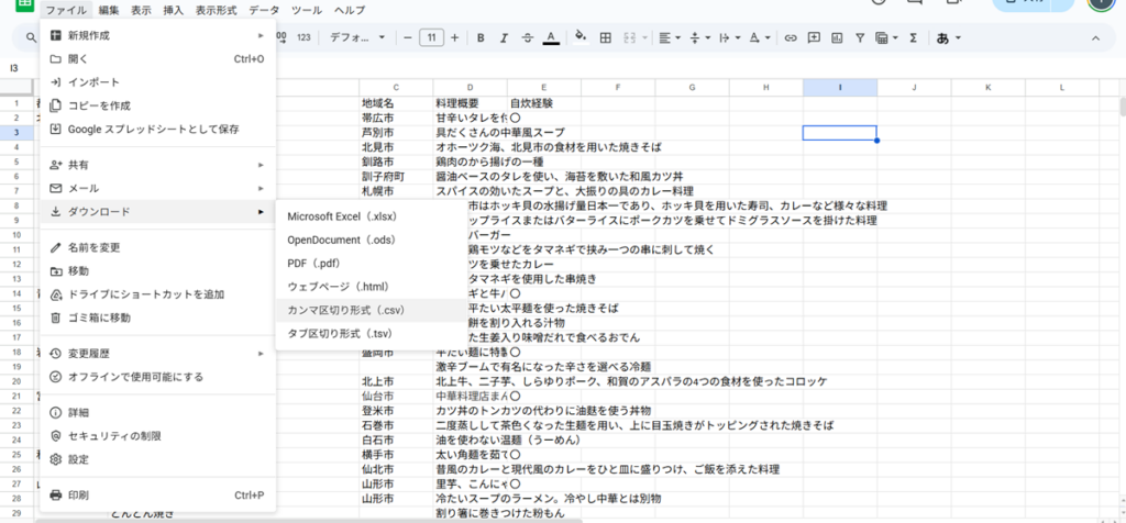 EXCELだと「名前を付けて保存」にてCSVファイルへ変換するので、一瞬少し悩んでしまいますが、メニュー「ファイル」→ダウンロード→カンマ区切り形式(.csv)にてCSVファイルへ変換が可能です。